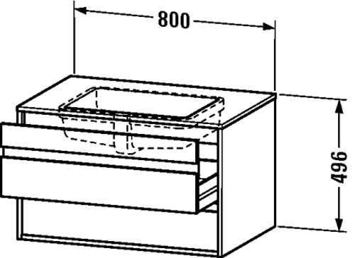 2 drawers, upper drawer including cut-out for siphon and siphon cover, countertop including one cut-out, for 1 undercounter basin f-bonded, central