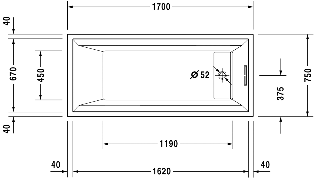 rectangle, built-in, with one backrest slope, with special waste and overflow, with support frame, 5 mm sanitary acrylic