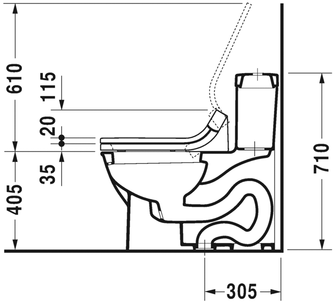 US-version, back to wall, elongated with syphonic jet action, 305 mm/12" rough-in, with Single Flush piston valve, top flush, vertical outlet, 1,28 gpf (4,8 lpf)
