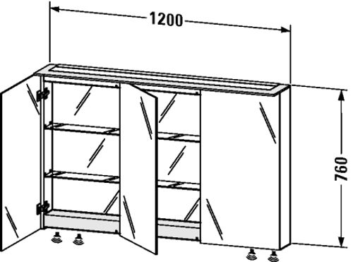 IP 44, 3 mirror doors, back panel inside mirror glass, 4 glass shelves (clear glass), 1 sensor switch bottom right, one socket unit with flap lid in top end, LED (lifespan > 30.000 hours), lamps non-exchangeable, Energy class: A+, LED module 3500 Kelvin light colour, 31 W, incl. Soundsystem and dimming function